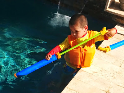 Mommy is on a girl's Vegas weekend Sat-Mon trip. That means Da Boys are home alone with Daddy. Which means we do 'Boys Stuff'. On Saturday, Daddy made chocolate chip pancakes for Casey: he ate 3, and 'round waffles' with chocolate chips on top for Sydney: he ate 2. We went swimming in the pool, where we played "Hulkie"... Which is Casey's name for the Incredible Hulk game in which Daddy plays "Hulkie" and chases Da Boys around the pool and throws them about like rag dolls. At Sydney's request, we played 'Marco Polo'. Afternoon activities included a bike ride to the toy store, where Da Boys picked out "Rocky and Rubble" figurines from the TV show Paw Patrol. After a stop home to trade Sydney's bike for the trailer-bike, we rode to Soupplantation for dinner. All that bike riding must have worked up appetites, cause Da Boys killed it at Soupplantation. Casey had a plate of veggies and 3! bowls of Mac and Cheese... and ice cream... and Jello. Sydney had a bowl of Mac and Cheese, 2 plates of veggies ( he asked for 2nd's!!).. and ice cream.. and Jello.